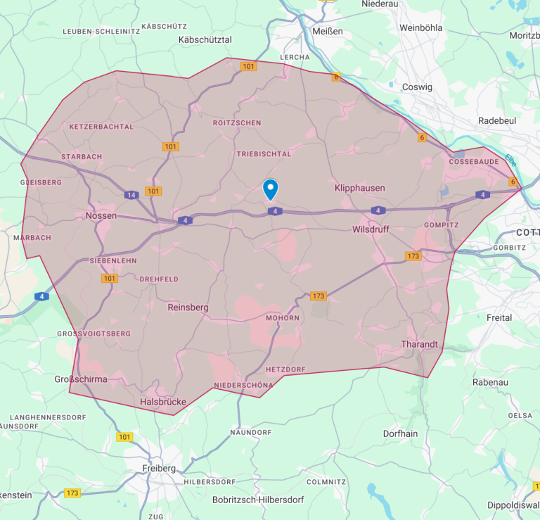 Mein Einzugsgebiet umfasst das Gebiet westlich von Dresden, in den Landkreisen Meißen, Sächsische Schweiz Osterzgebirge und Mittelsachsen.